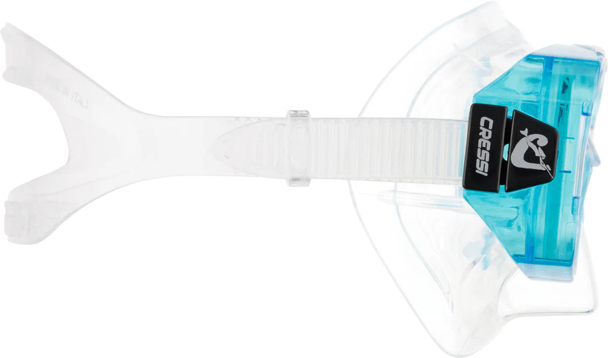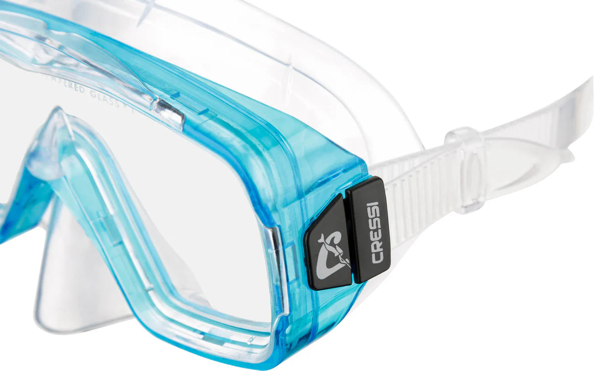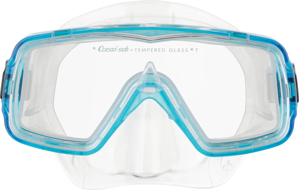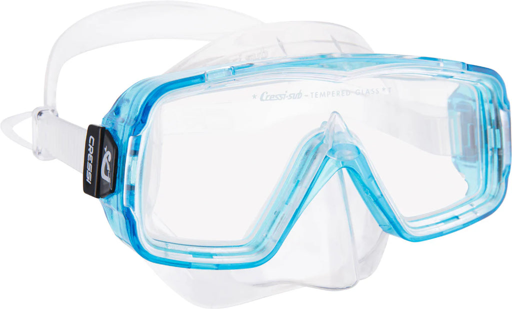 This Sirena has a single tempered glass lens and is designed for snorkeling, swimming and scuba diving.
