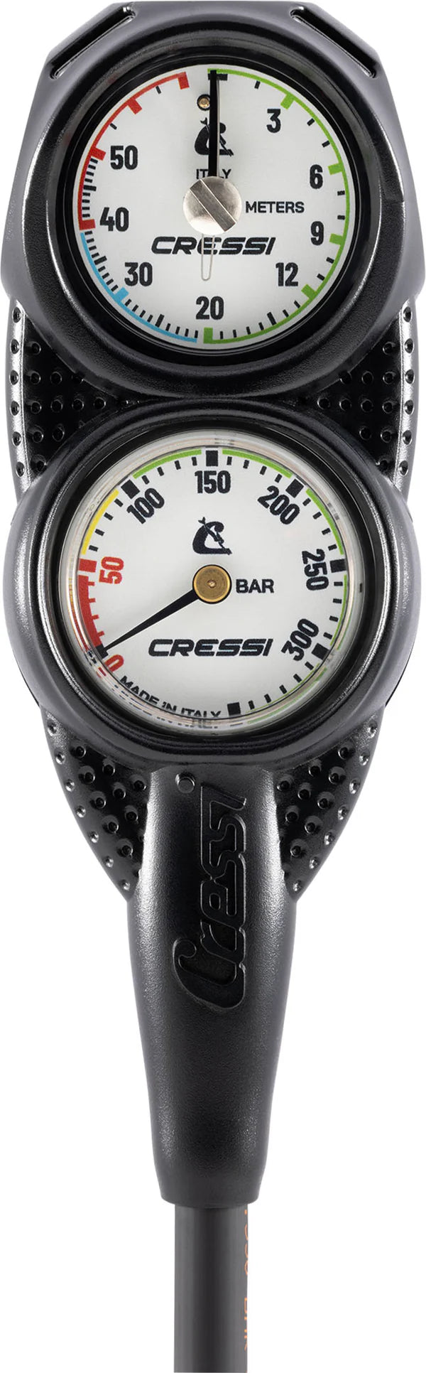 Compact and built to last, this two-gauge console combines a Mini SPG and depth gauge. The textured boot is easy to handle, even while wearing gloves, and can be rigged with a clip or bungee and secured to the diver’s BC for a streamlined profile in the water.