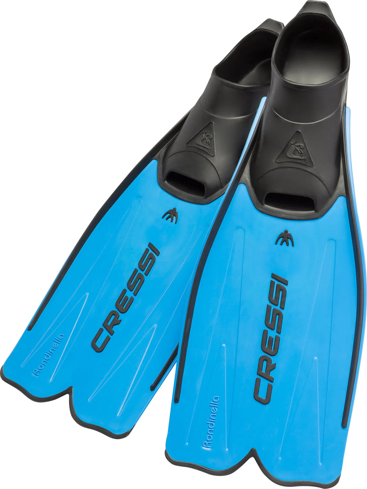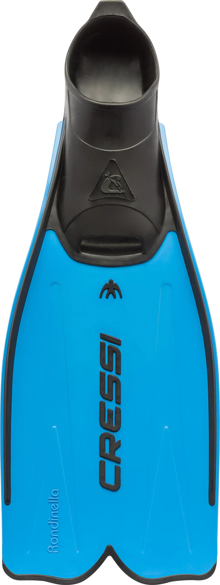 All of cressi’s fifty-year experience has gone into these fins, which are a modern revival of the successful principles of the glorious light blue rubber rondine fins. The blade is made from light and at the same time reactive polypropylene and during moulding is coalesced with a soft, flexible thermo-rubber (elastomer), used for the foot pocket, for the frames and for some inserts. This mix makes the rondinella fins light and powerful: they are easy to use, not too demanding, and perform generously at the same time. The computer-designed foot is enveloping and anatomical, making it easy to put them on and perfect for extended use. Rondinella fins are perfect for snorkelling, free diving, and long swims
