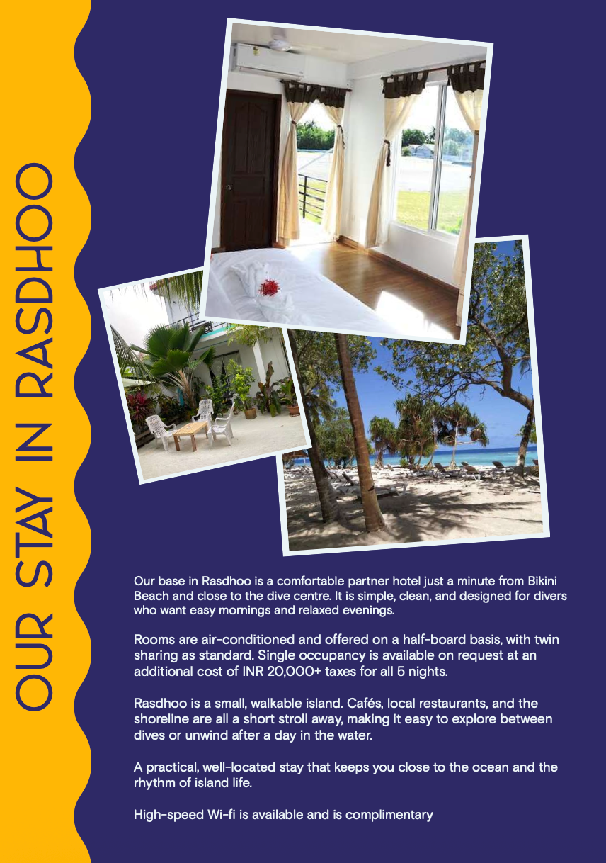 Above the surface, Rasdhoo keeps its pace slow and its character intact. Local cafés, sandy lanes, and welcoming faces give the island an easy rhythm, one that carries into the dives themselves. Your home for the trip is a comfortable partner hotel just a minute from Bikini Beach and close to the dive centre. It is a simple, clean space designed for divers who want easy mornings and relaxed evenings, complete with air-conditioning and complimentary high-speed Wi-Fi.