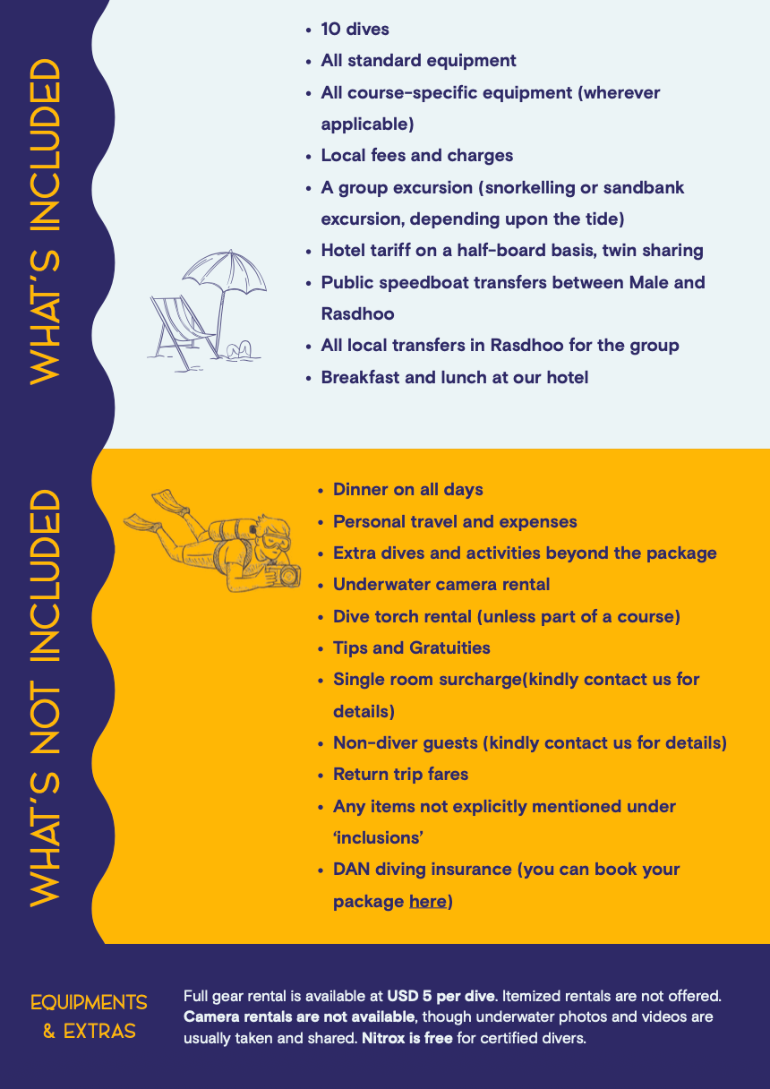 Guided Diving: 10 dives including all standard and course-specific equipment.